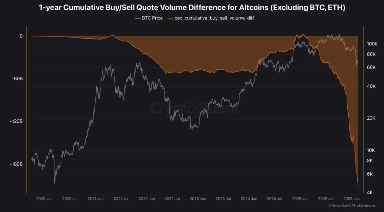 “Retail is out. Smart money rotated. No institutional alt accumulation in sight. This is not a dip. It’s 13 months of continuous net selling on CEX spot,” one analyst noted.